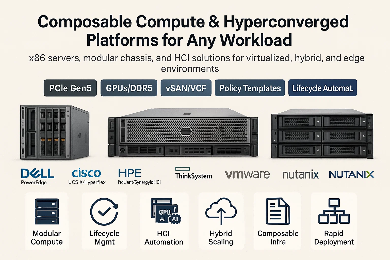 x86 servers and modular/composable platforms with HCI & virtualization-policy-based profiles, lifecycle automation, and ROBO/edge options.